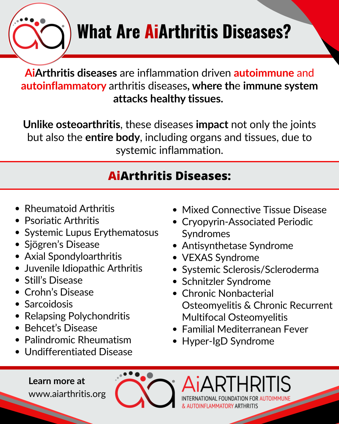 Easily share information about your AiArthritis Disease with these educational one page information of all 23 AiArthritis diseases!